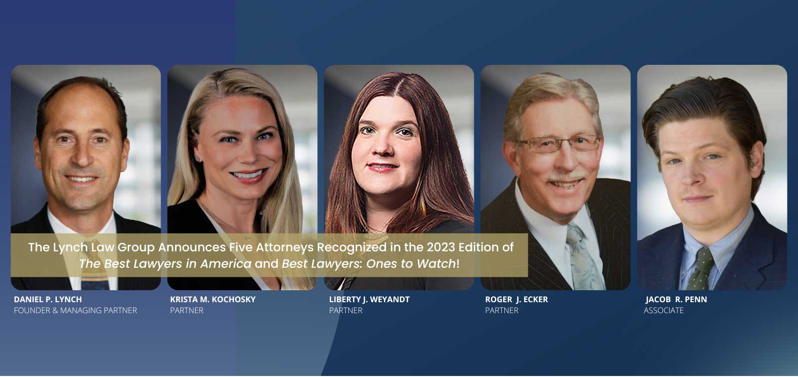 The Lynch Law Group is pleased to announce that Dan Lynch, Founder and Managing Partner; Krista Kochosky, Chair of the Real Estate practice; Liberty J. Weyandt, Chair of the Family Law practice and Roger Ecker, were selected by their peers for inclusion in the 2023 edition of The Best Lawyers in America. Associate Jacob Penn was selected by his peers for inclusion in the 2023 Best Lawyers: Ones to Watch.